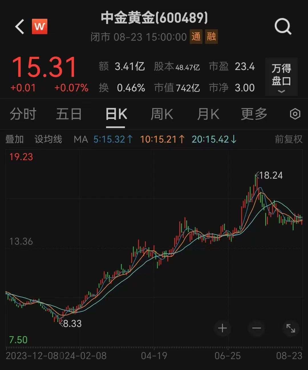 2024年以来,中金黄金股价最高涨幅达119%。8月23日,中金黄金股价以15.31元报收,市值为742亿元。